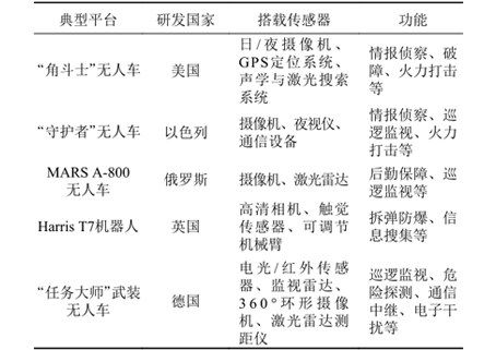 ÒÔÉ«ÁС¢¶íÂÞ˹¡¢Ó¢¹úºÍµÂ¹úÒ²Ïà¼Ì¾ÙÐÐÁ˽µØÎÞÈËϵͳµÄÑÐÖÆÊÂÇ飬²¢Ñз¢³öÁËһϵÁÐÏȽøµÄ²úÆ·£¬²úÆ·ÁбíÈç±í1Ëùʾ¡£ÀýÈ磬ÒÔÉ«ÁÐÑз¢µÄ“ÊØ»¤ÕߔϵÁÐ×ÔÖ÷ÎÞÈ˳µ¿ÉÒÔÍŽá´îÔØµÄ´«¸ÐÆ÷ÓëÈÚºÏËã·¨£¬×ÔÖ÷Õì̽Óëʶ±ðΣÏÕÕϰ£¬Ö´ÐÐѲÂß¡¢¼àÊÓÓëС¹æÄ£µÄ»ðÁ¦¹¥»÷ʹÃü£»¶íÂÞ˹ÑÐÖÆµÄMARSA-800ÎÞÈ˳µ¿ÉÒÔÖ´ÐÐÔËÊäºÍºóÇÚ°ü¹ÜÒÔ¼°¸ú×Ù¼àÊÓµÈʹÃü£¬²¢¿ÉÒÔÔÚÖ´ÐÐʹÃüµÄÀú³ÌÖÐʵÏÖ×ÔÖ÷·¾¶ÍýÏ룬¹æ±ÜÕϰ£¬¸ÃÎÞÈ˳µÒÑÔÚÐðÀûÑÇÕ½³¡¾ÙÐа²ÅÅ¡£Ó¢¹úºÍµÂ¹ú¶Ô½µØÎÞÈËϵͳµÄÑо¿Ò²¿ªÕ¹µÃ½ÏÔ磬Ӣ¹úÓÚÉÏÊÀ¼Í60ÄêÔ¾ÍÍÆ³öÁËÊÖÍÆ³µÅű¬»úеÈË£¬ØÊºóÓÖÍÆ³öHarrisT7´¥¾õ·´Ïì»úеÈË£¬ÓÃÓÚÖ´Ðв𵯡¢Åű¬µÈΣÏÕʹÃü£»µÂ¹úÀ³Òð½ðÊô¹«Ë¾¿ª·¢µÄ“ʹÃü¾Þ½³”µØÃæÎä×°Õì̽ÎÞÈ˳µÖ÷ÒªÓÃÓÚÖ´ÐÐÕ½Êõ¼àÊÓ¡¢Î£ÏÕÎï¼ì²â¡¢Ò½ÁƺóËÍ¡¢Í¨Ñ¶ÖмÌÒÔ¼°»ðÁ¦Ö§Ô®Ê¹Ãü¡£